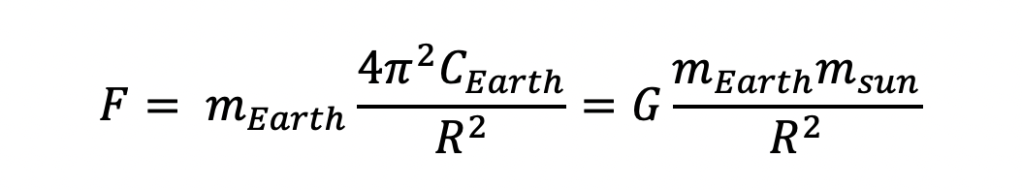 Let’s substitute G into our original equation that describes the gravitational force of the sun on the Earth, where Msun has been inserted in the numerator to compensate for the Msun inserted in the denominator contained in the term G: