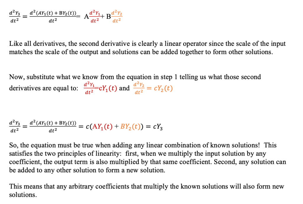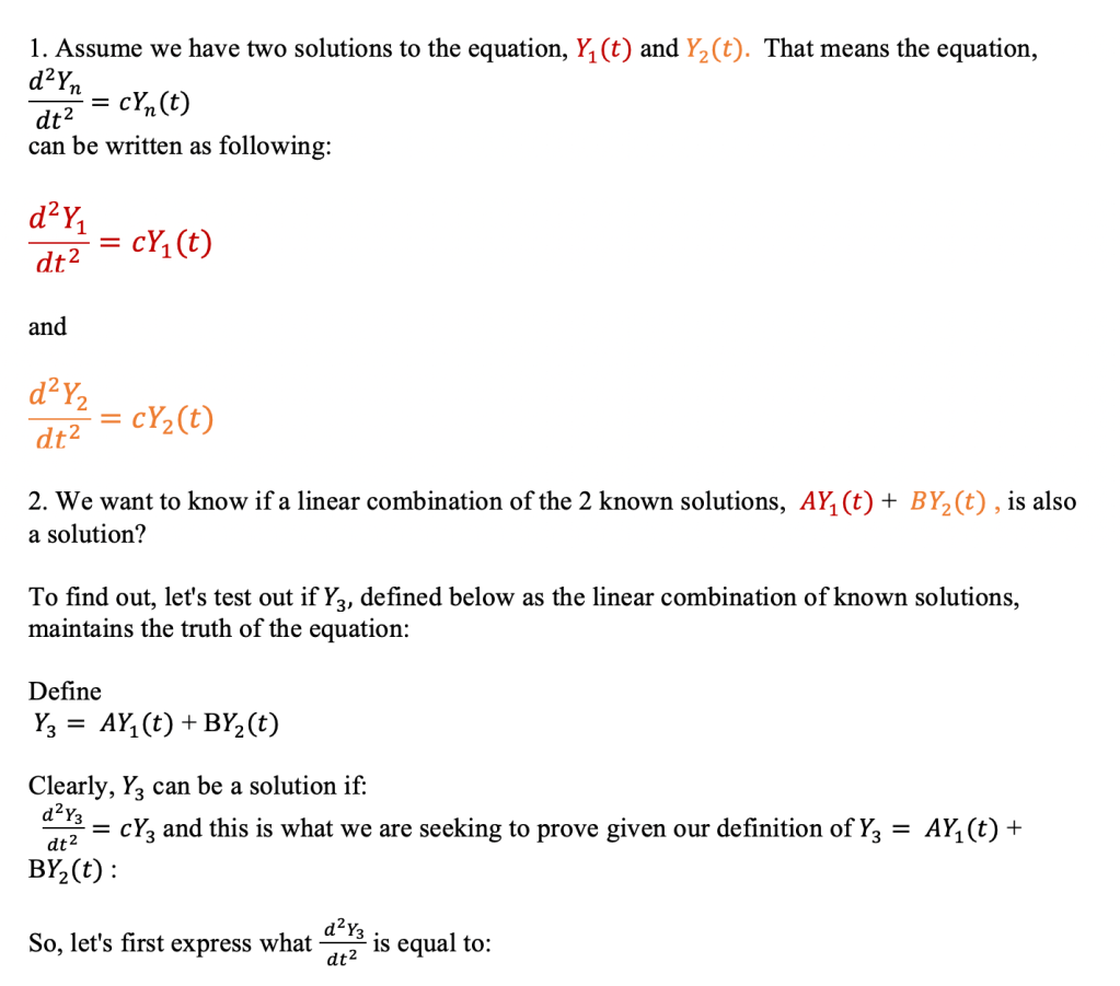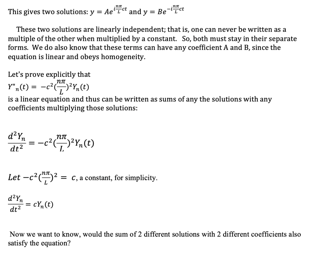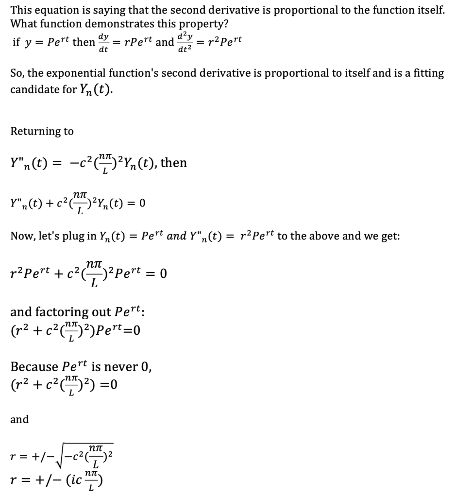 (Note: in the above the imaginary number i was dropped from multiplying the Dn coefficient. This can be done by constructing the original Cn and Dn coefficients as complex conjugates for which the i term would drop out after converting to sine and cosine, and you would obtain the purely real solution as shown above. The reason we know we can do this is because another solution of the original equation Y” + CY=0 is just in terms of sin + cos , without any imaginary numbers multiplying it.).