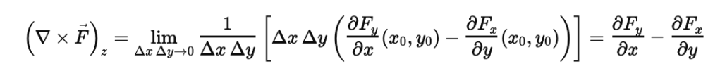 In the zy plane, z is a vertical edge and y is a horizontal edge; in the xz plane, x is a vertical edge and y is a horizontal edge, and of course, in the yx plane, y is the vertical edge and x is the horizontal edge. But what if in the yx plane, for instance, we viewed the y’s as our horizontal edges and the x’s as our vertical edges due to a rotation? You would actually still get the same exact value for curl if you rotated each plane 90 degrees clockwise. For example, if you rotated the xy plane 90 degrees clockwise, now x would be the vertical edge and y would be the horizontal, and we would calculate (dFx/dy – dFy/dx) instead of (dFy/dx – dFx/dy). But switching the order would still preserve the value of the curl. If when x was horizontal, dFx/dy was positive (for example, with the top edge experiencing a stronger flow rightwards than the bottom edge), we know that this would contribute to a negative clockwise rotation so we would have originally subtracted this positive dFx/dy value. However, after rotating the plane 90 degrees clockwise so that x was now on the vertical edges and y on the horizontal edges, we would now find that dFx/dy would be negative already (with the right edge showing a stronger downward flow than the left edge), correctly indicating clockwise contribution. So, we would no longer need the negative sign in front of dFx/dy. Now, however, we would need the negative in front of the dFy/dx term instead to correct for its contribution, which exactly what the new order of (dFx/dy – dFy/dx_) does! So by rotating the plane by 90 degrees, we do not affect the value in the parentheses. This agrees with the concept that you still get the same vector even if you rotate the frame.