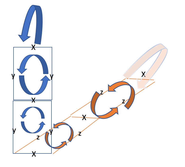 The xy plane and xz planes are experiencing increasing counterclockwise curl as you move up in y and up in z, respectively. While this increased curl causes an additional counterclockwise curl around the x axis in the first case, it causes an additional clockwise curl around the x axis in the second case. I haven’t been able to visualize why these opposite curls happen around the x-axis, but the amazing fact is that the mathematics predicts they should happen, and they do happen, even though these rotations are extremely difficult to visualize.