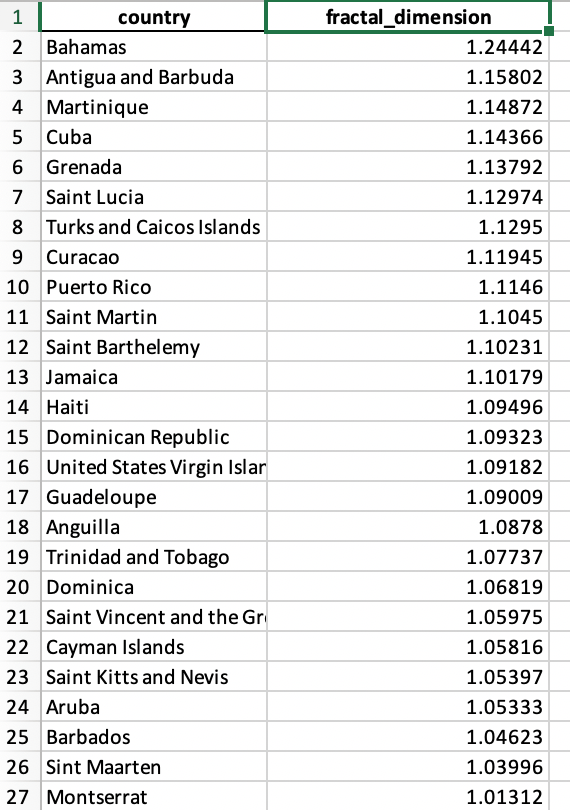1.09) and Montserrat (the lowest fractal dimension