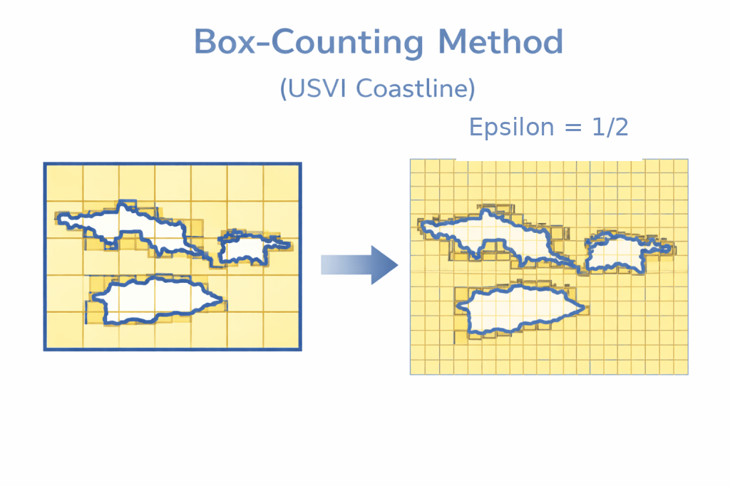 This post is about how an entire geological story can be embedded in a single number, a number that weaves together the degree of volcanic activity, rock type, river flow, sea level rise and presence of coral reefs, amongst other influences. And from the implications of this number in the geological story, we can derive general principles that apply to biology too. This special kind of number is the fractal dimension, used to measure a fractal shape, which is defined as a shape with meaningful detail at every scale, so zooming in reveals new structure rather than a smooth edge. Many patterns in nature exhibit fractal-like behavior over a variety of scales: for example, a few famous fractal patterns include cloud perimeters, river networks, tree branching, and coastlines. We will focus on the last of these- the fractal quality of coastlines- to help us understand the unique stories of a few islands in one of my favorite places in the world: the Caribbean. We will also derive a new way to understand fractal dimension in terms of a race between two dimensions.