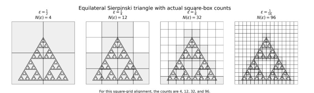 . As we are shrinking the boxes, we get a more and more accurate estimate because the number of infintesimally sized boxes match very closely with the infinitesimally sized fractal copies. In the case where a fractal lacks self-similar copies, such as an irregular coastline, the boxes themselves can be considered the number of copies, or mass, as the boxes continue to shrink.