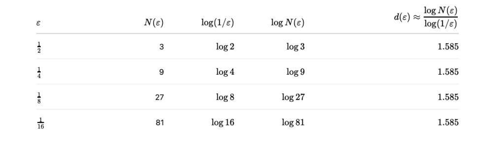 We can understand through these three examples that nature often forms fractals because of repetitive processes that iterate similar to the process that creates the Sierpinski triangle. In the case of the coastlines, we see that the repetitive process of waves crashing into the shoreline can create very intricate patterns, whose complexity increases depending on how amenable the geological structure is for waves to carve out patterns. The very complexity of this action means that we do not get self similar fractals that are produced with ideal mathematical constructions (like the Sierpinski Triangle), but rather we get imperfect and jagged structures whose dimensions are between 1 and 2. Nevertheless, we see that from our previous discussion, we can still calculate the fractal dimension of these imperfect shapes using the box counting method, which can produce a reliable estimate of how a coastline consistently behaves over defined ranges of scaling factors. Moreover, we now know that behind the box-counting of the coastlines lurks an even deeper principle: a race between the perimeter and area of the fractal, with perimeter ballooning to infinity and area shrinking to 0. It is this mathematical race that lies at the very foundation of understanding whether a fractal behaves more like a line or more like an area, and such understanding can extend to the inter-dimensionality of other fractal shapes as well. For instance, if we have a fractal shape between the second and third dimension , we can view such a shape’s fractal dimension as a race between its area ballooning to infinity and its volume shrinking to zero. Fractal dimension, then, is not just a number. It’s a way of describing where a shape lives within a dimensional race, and it’s nature’s way of revealing hidden structure.