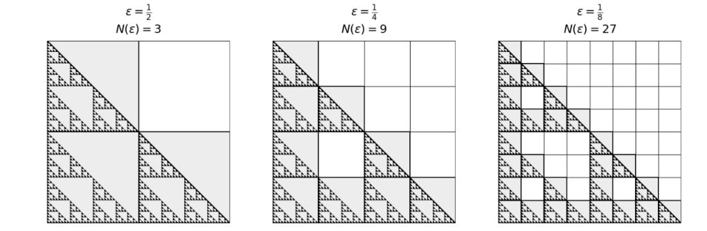 Using the example of the Sierpinski triangle, we already know that when we use the mass-scaling formula for self similar fractals, we have 3 copies of the original, each copy shrunken by 1/2 length compared to the whole. Will the box counting method result in the same fractal dimension? Let’s use the more straightforward example of the Sierpinski Right triangle, formed using the same repetitive process of connecting midpoints and removing the middle 1/4 of each triangle. The Sierpinski right triangle makes the box counting method most clear. We assume we started with a box of side length 1 that had the entire triangle inside it, and then scaled that box with the scaling factors shown below: