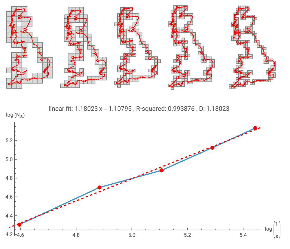 Let’s put this box counting formula to work by using the classic example of how to calculate the fractal dimension of the coastline of Great Britain: